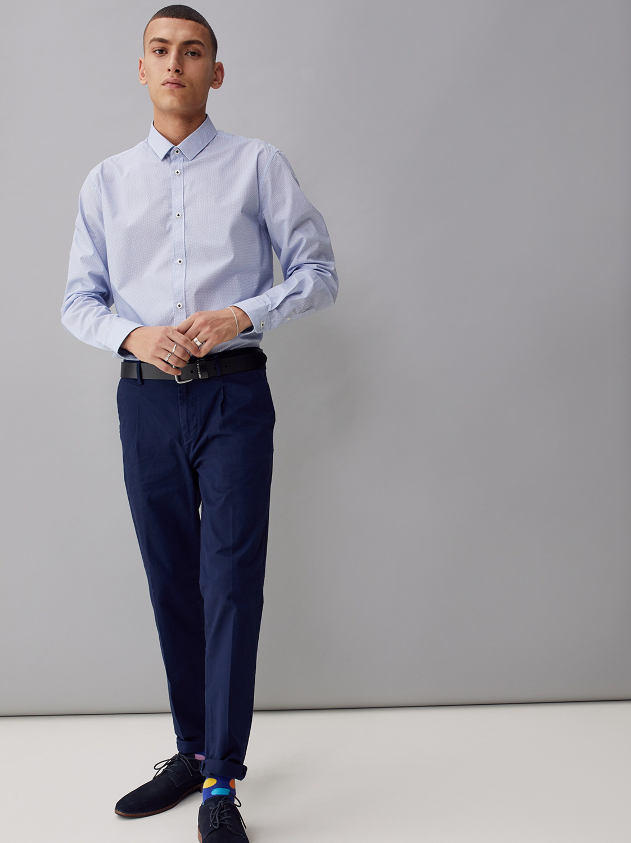 Najlepsze biurowe stylizacje - pokażemy Ci na co zwrócić uwagę! Klasyczna koszula musi dobrze leżeć i powinieneś się w niej komfortowo czuć. Idealne dopasowanie zależy od szczegółów! Górny guzik przy kołnierzu powinien być łatwy do zapięcia, front koszuli powinien być bez fałd i załamań, a guziczki koszuli nie powinny się rozchodzić. Koszula nie powinna być ani zbyt luźna, ani zbyt ciasna. Mankiety idealnej koszuli powinny sięgać tuż nad nadgarstek. Wskazówka: Zwróć uwagę na subtelne kolory i delikatne wzory, które mogą pasować do reszty Twojego stroju. Koszulę możesz nosić z krawatem lub bez, ten wybór należy wyłącznie do Ciebie!